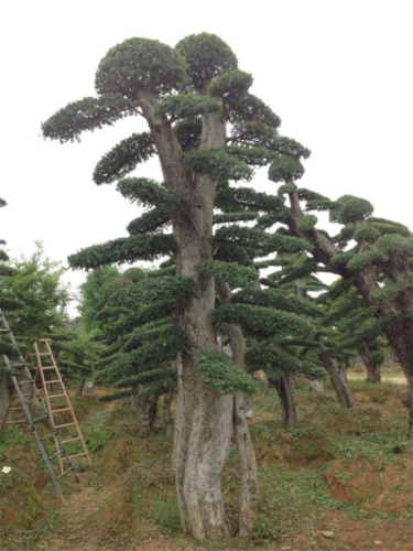 造型榆樹:選用深山老林采挖的形態(tài)各異的老榆樹移植至素沙土地,經(jīng)過數(shù)年的精心培育,枝葉茂盛之后方可造型。
